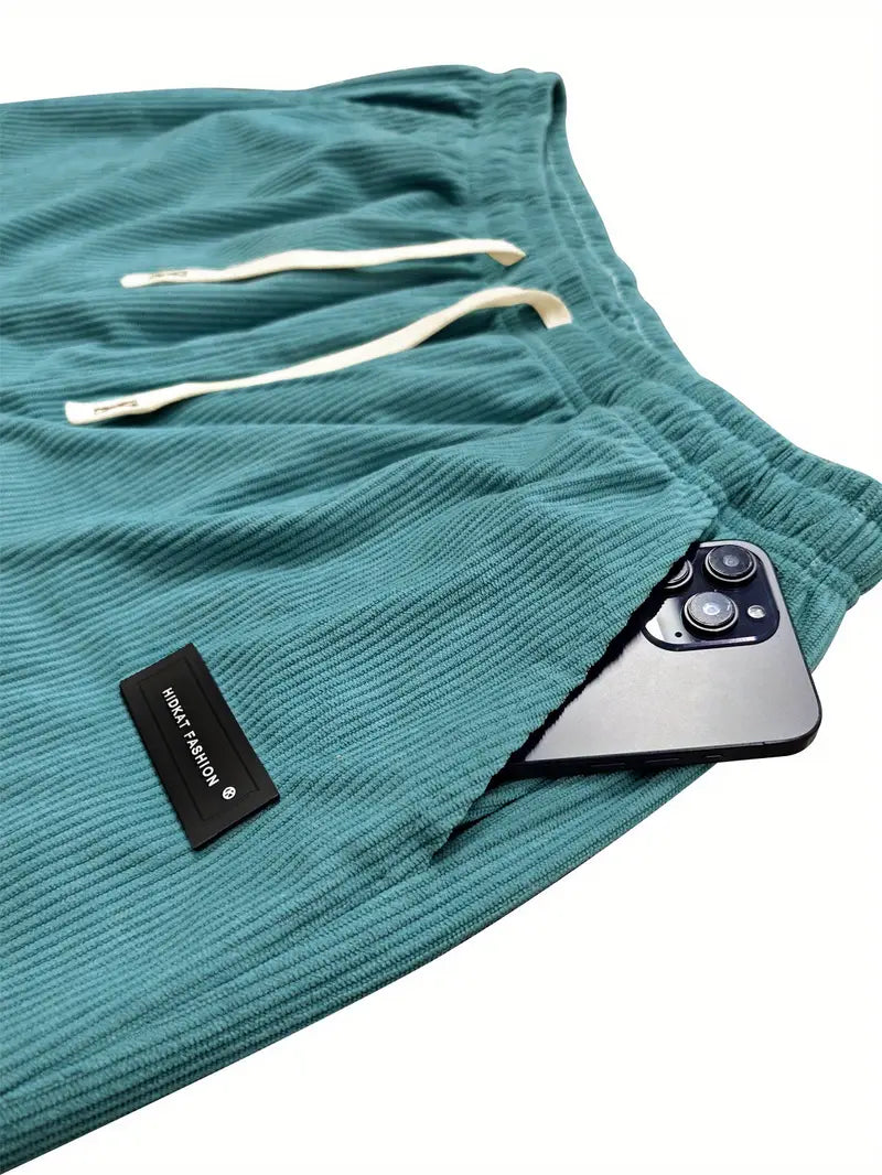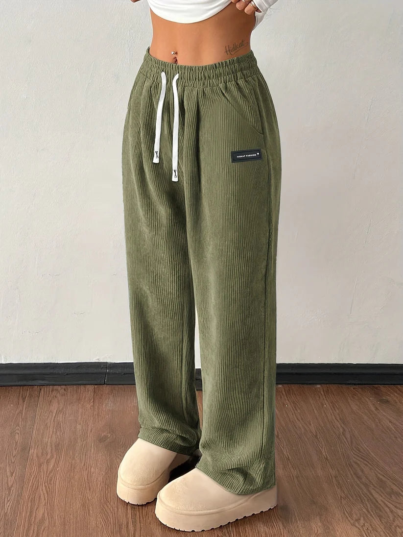 Crafted from soft ribbed corduroy, these wide-leg pants balance structure with fluid movement. The high-rise fit and adjustable drawstring sculpt a clean silhouette, while deep pockets add functionality without bulk. Lightweight, breathable, and designed to move, they redefine casual sophistication for everywhere you go.